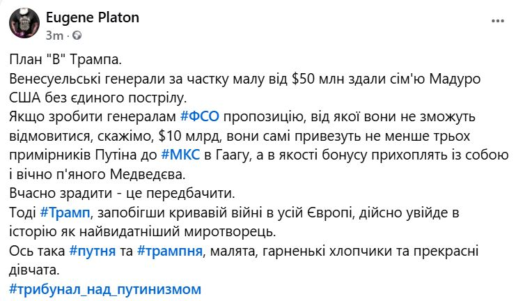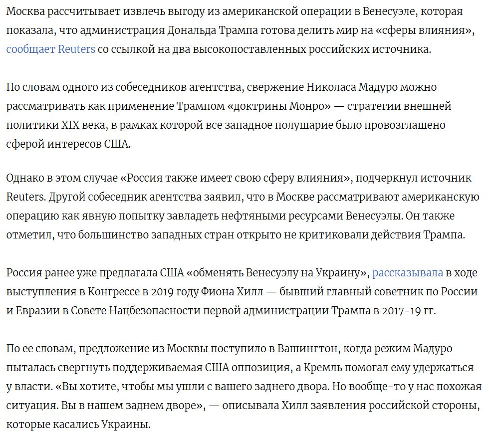 Путіну, звичайно, треба було погоджуватися на умови Трампа і закінчувати війну ДО арешту Мадуро. Тепер переговори будуть проходити в менш вигідних для Кремля умовах: Трамп на коні; власний табір деморалізований; є ризик, що будь-який прояв того, що буде сприйнято як «неадекватність», підштовхне когось із членів внутрішнього кола в напрямку роздумів про «венесуельський сценарій».