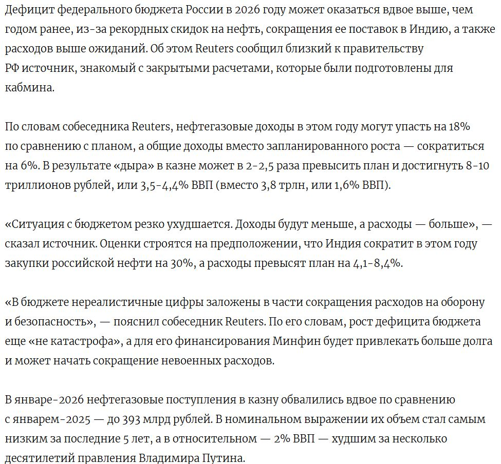Російський бюджет, згідно з непублічними розрахунками уряду, незважаючи на дві хвилі підвищення податків, цього року може отримати астрономічний дефіцит у 10 трильйонів рублів через скорочення закупівель нафти Індією та знижки під $30 за барель.