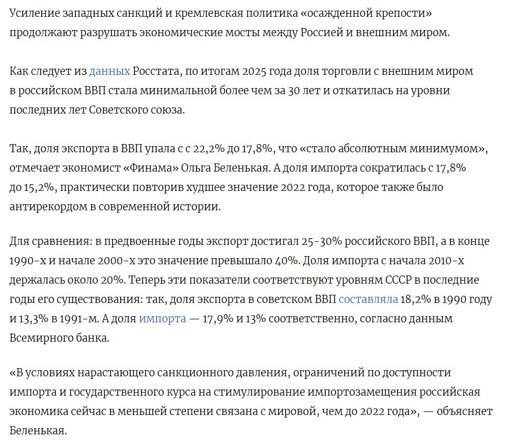 Частка торгівлі із зовнішнім світом у російській економіці впала до рівнів останніх років СРСР.